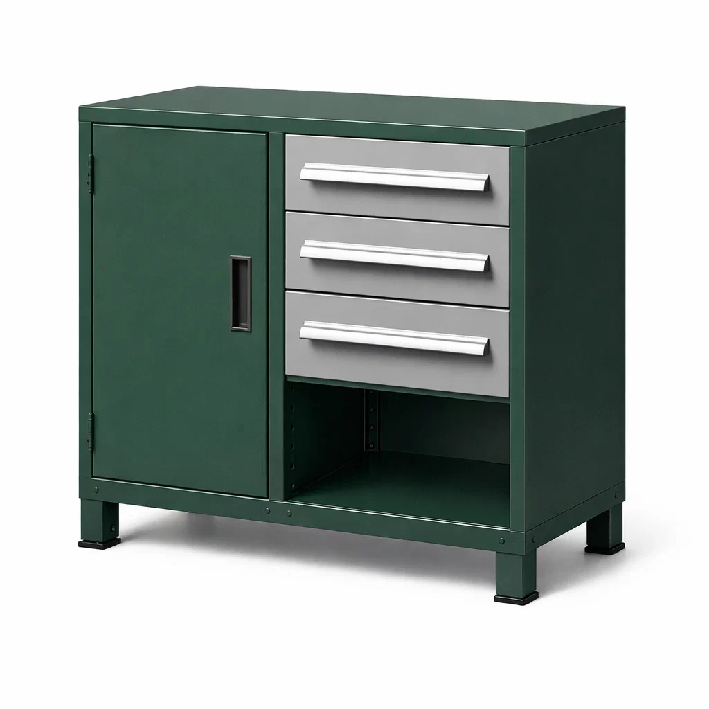 Er verfügt über 3 Schubladen und ein Fach mit Flügeltür, geöffnet mit Griff.